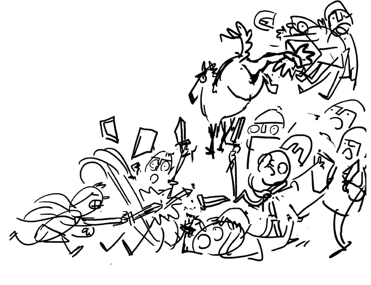 En attendant que la rouquine revienne accompagnée de divers nains, fées, bêtes et rois, voici les différentes étapes d’un dessin de bagarre.