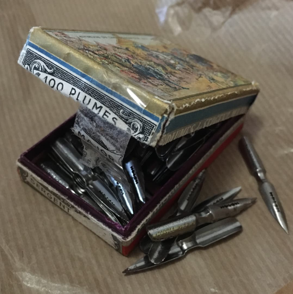 Quelle joie, j’ai enfin trouvé une boîte pleine de mes plumes chéries ! Si j’arrive à les préserver de la rouille, j’ai de quoi aller jusqu’à la retraite (au XXIIe siècle)